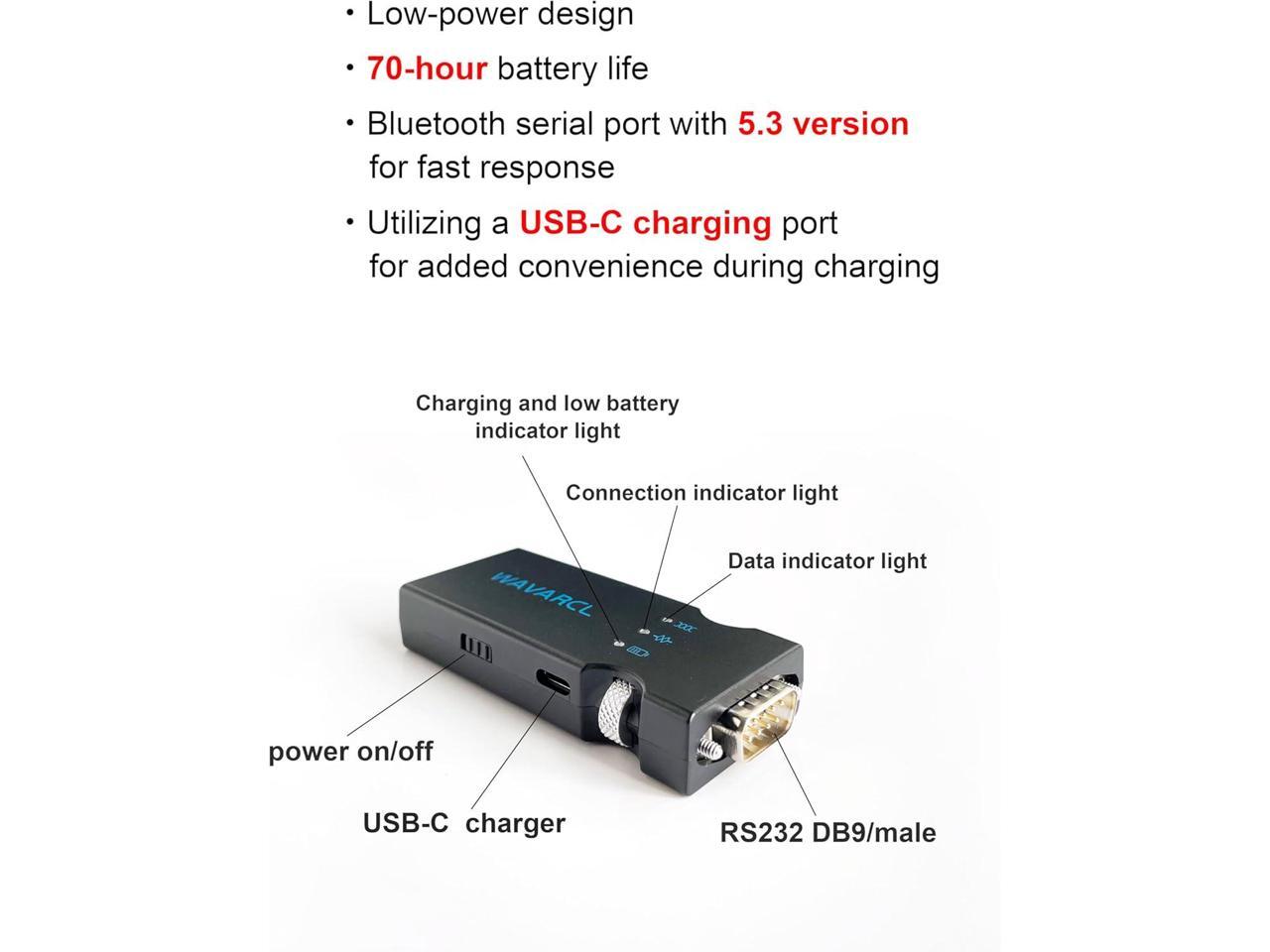 - Battery lifeThe Bluetooth RS232 adapter adopts a Type-C interface for charging. When fully charged, it can provide 70 hours of battery life, ensuring continuous operation for your work.