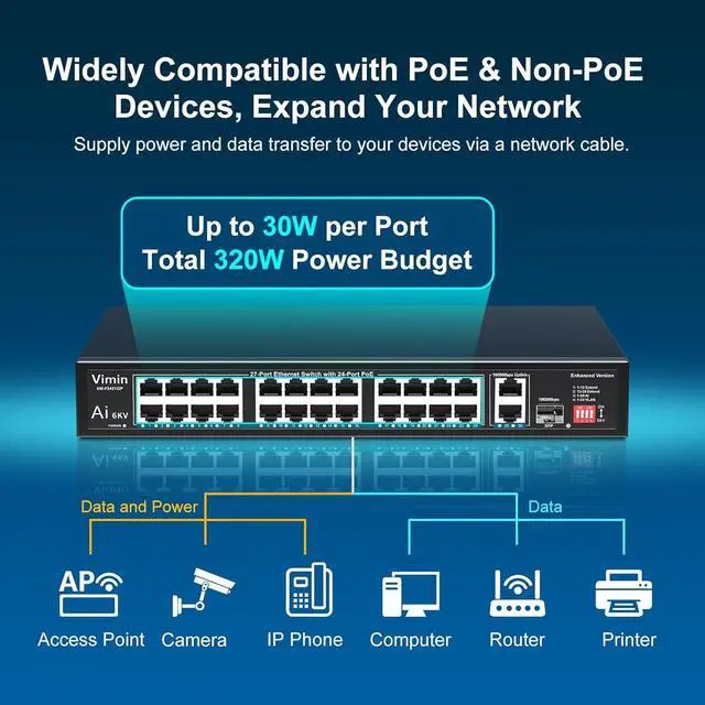 24x PoE Ports & 2x 1000Mbps Uplink Ports - 27 port network PoE switch with 24 Port PoE+ 10/100 Mbps RJ45 ports and 2 gigabit uplink ports & 1 SFP Port. This switch offers 24 high-speed PoE+ ports for data transmission and power delivery over the network cable, compatible with routers, wireless APs, cameras and more. Besides, along with 2* 1000Mbps uplink ports for connecting to NVRs, the internet and more.