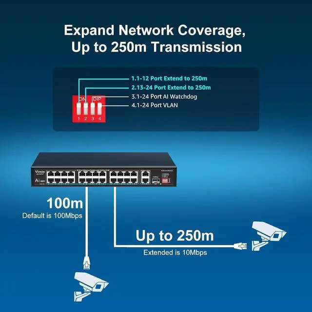 One-Key VLAN & Extend 250m - Our 27-port PoE switch features an advanced One-Key VLAN mode. By isolating the 1-24 ports from each other while maintaining communication with the uplink ports, this mode improves network security and optimizes bandwidth utilization. Additionally, this switch with an extended distance of up to 250m. supports transmission speeds in 10Mbps.
