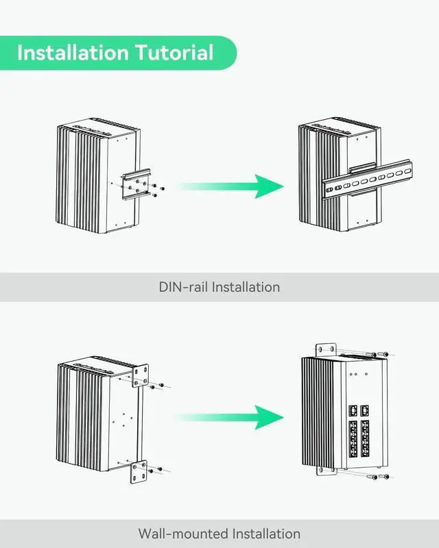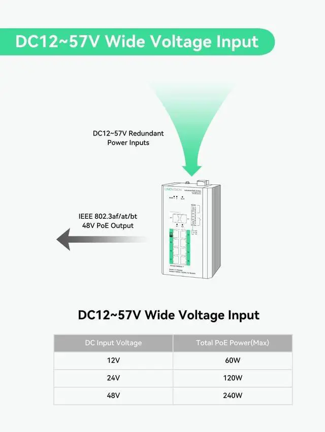DC12~57V WIDE VOLTAGE INPUT - Supports 2 channels of DC12~57V redundant power inputs. It is designed for reliable PoE power output in solar power systems, vehicles or other applications that without AC power input.