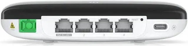 • Networking interfaces (1) SC/APC, ITU-G.984 GPON WAN port (4) GbE RJ45 LAN ports WiFi 802.11ax 5/2.4 GHz channels PoE interface (1) PoE in, 24V passive PoE Management interface Ethernet in-band PON Button Factory-reset Max. power consumption 11W Power method USB-C 5VDC, 3A 24V passive PoE, 0.5A