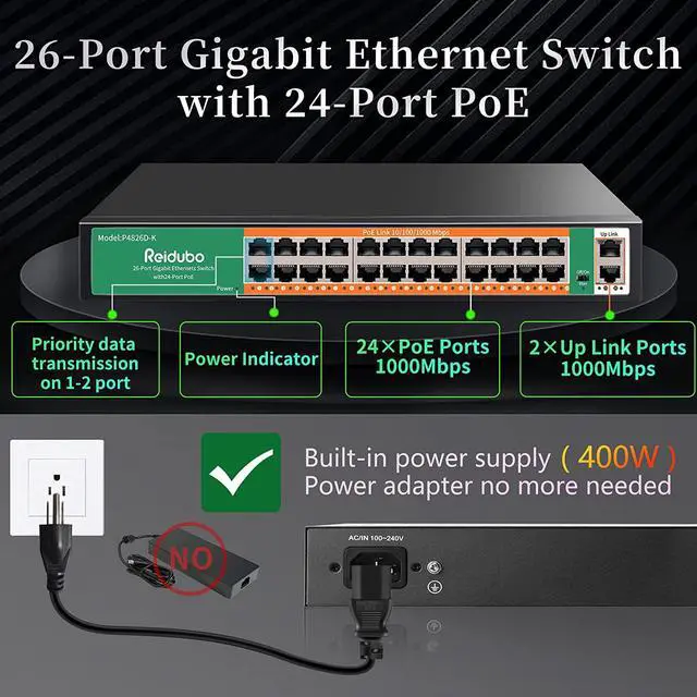 Built-in Power Supply & 4KV Lightning protectionReidubo 26-port gigabit PoE switch built-in power supply (400W). the power adapter is no more needed, which makes the PoE Switch simpler and lighter. Ideal for PoE Security Camera, Access Point, IP Phone, and other PD devices.4KV lightning protection design allows your products and devices to operate stably even in bad weather. Each port can intelligently detect the power required by the device. Normal output 15.4W, maximum output 30W