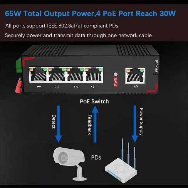 The total PoE Output of this industrial ethernet switch is 65W, each port can reach up to 30W.