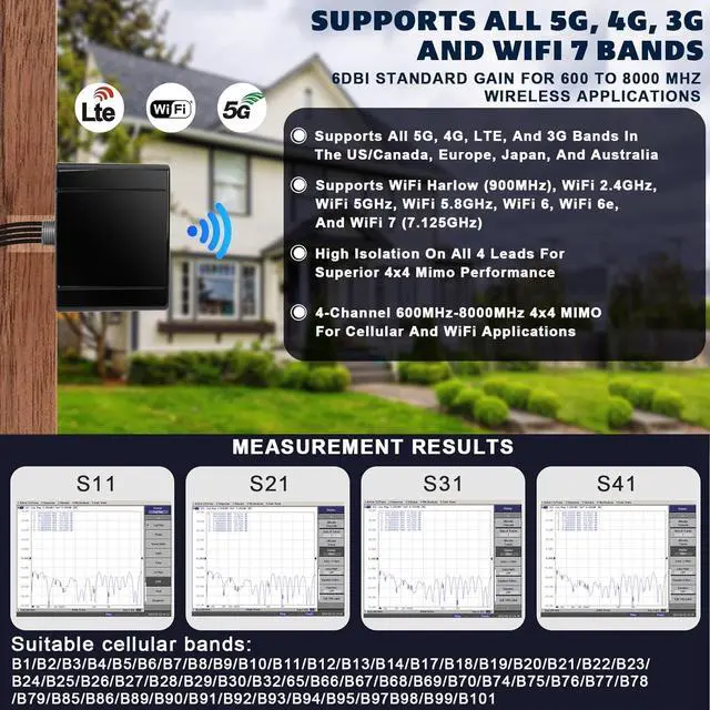 The 4X4 cellular MIMO antennas provide ultra-wideband performance from 600 to 8000 MHz, enabling use across different carriers and technologies and preparing cellular technologies for 5G applications up to 6 GHz as well as Wi-Fi applications up to 7.125 GHz.
