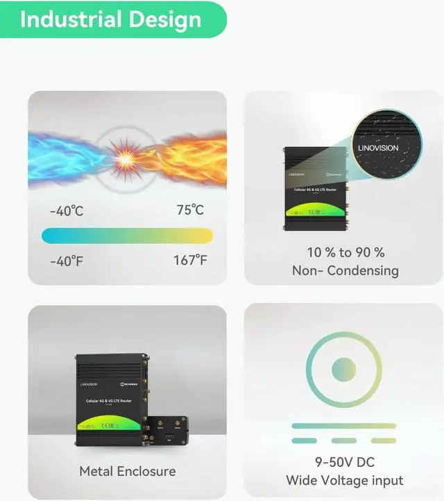 INDUSTRIAL DESIGN -Aluminium housing; Wide voltage input 9-50V DC and wide operating temperature range -40°F ~ 167°F (-40°C ~ 75°C), suitable for harsh environments.