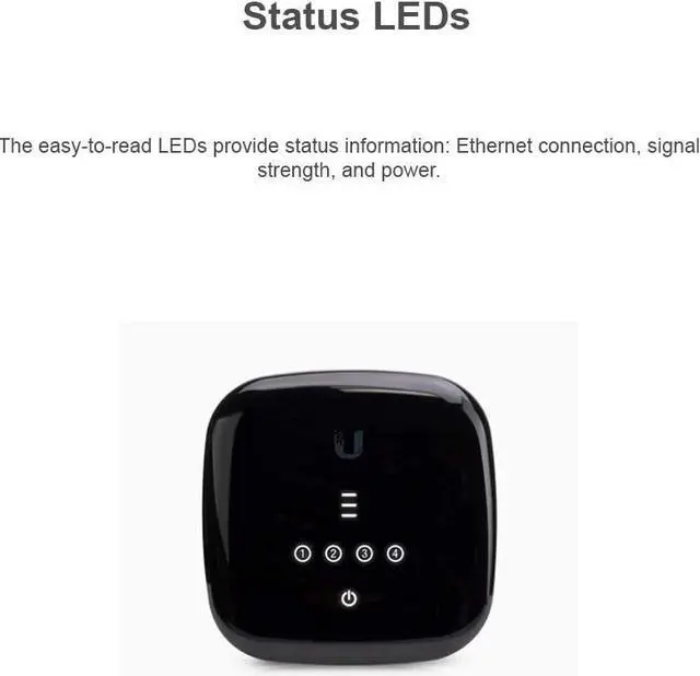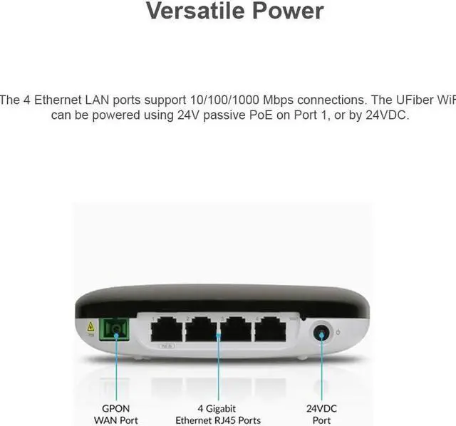 The 4 Ethernet LAN ports support 10/100/1000 Mbps connections. The UFiber WiFi can be powered using 24V passive PoE on Port 1, or by 24VDC.