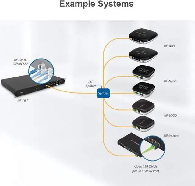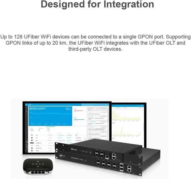 Up to 128 UFiber WiFi devices can be connected to a single GPON port. Supporting GPON links of up to 20 km, the UFiber WiFi integrates with the UFiber OLT and third-party OLT devices.