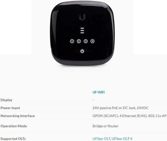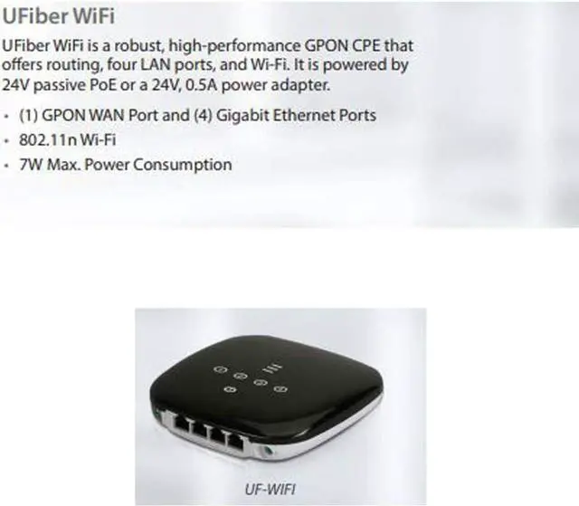 UFiber WIFI is a robust, high-performance GPON CPE that offers routing, four LAN ports, and Wi-Fi. It is powered by 24V passive PoE or a 24V, 0.5A power adapter.