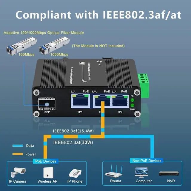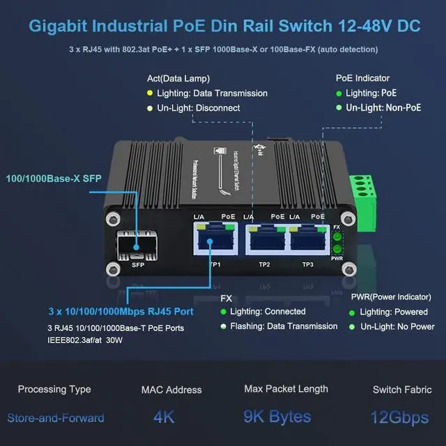 IEEE802.3 10BASE-T, IEEE802.3u 100BASE-TX/FX, IEEE802.3ab 1000BASE-T, IEEE802.3z 1000BASE-X, IEEE802.3ae 10GBase-R, IEEE802.3p QoS, IEEE802.1d Spanning TreeB, IEEE802.3af/at(PoE/PoE+)Forward & Filtering Rate:14880pps (10Mbps), 148800pps (100Mbps), 1488000pps (1000Mbps)Packet Buffer Memory:4MbitsProcessing Type:Store-and-ForwardMax Packet Length:9K Bytes Jumbo FrameAddress Table Size:4K MAC AddressesInterface:3 x RJ45 with 802.3at PoE+ injector function (Ports 1 to 3) + 1 x SFP 1000Base-X or 100Base-FX (auto detection) PoE Standard: IEEE802.3af/at 30WPower Pin Assignment:4/5(+), 7/8(-) PoE Budget:Up to 90W PoE budget (48VDC), 90W PoE budget (24VDC), 60W PoE budget (12VDC) Input Power: 12~48VDC, 4-pin terminal block Power Consumption:<95WOperating Temperature:-40°C to 80°C (-40°F to 176°F)Storage Temperature:-40°C to 85°C (-40°F to 185°F) LNK-IMC103GP