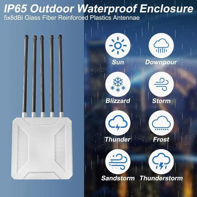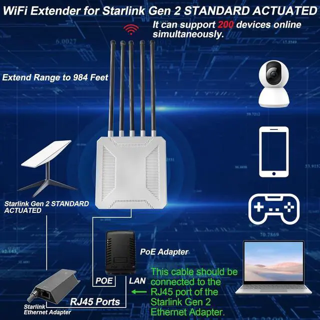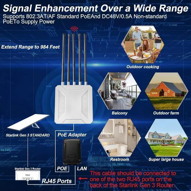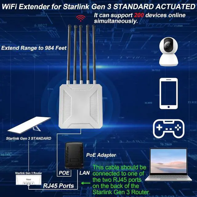 ----Still frustrated by weak outdoor network signals and slow transmission speeds? The 3000Mbps Outdoor Starlink WiFi Extender is designed to break through network boundaries and redefine the outdoor network experience with cutting-edge technology! ----Equipped with high-speed transmission chips, it offers an ultra-high speed of 3000Mbps, enabling instant loading of HD videos, rapid transfer of large files, and low-latency gaming. Its performance rivals that of high-end routers. Whether for work-related tasks or leisure activities, it effortlessly meets all your needs. With IP67-rated waterproof and dustproof capabilities, it remains stable even under extreme conditions such as heavy rain, sandstorms, or accidental submersion, fearlessly tackling any weather challenge. ----In terms of signal coverage, the 984-foot wide coverage range, combined with optimized antenna design and signal enhancement technology, can easily penetrate obstacles and eliminate signal dead zones, ensuring stable signals in every corner of farms and courtyards. Its powerful device connectivity is also outstanding, supporting up to 200 devices online simultaneously, ensuring smooth and lag-free performance for family gatherings, smart farm equipment operation, and multi-device entertainment during RV travel. ----Whether you're managing a vast farm and need real-time data transmission for agricultural equipment, hosting a party in your backyard and ensuring guests have reliable network access, or embarking on an RV trip and keeping your network connected throughout the journey, the 3000Mbps Outdoor Starlink WiFi Extender is the perfect solution, making it the top choice for enhancing outdoor network quality!