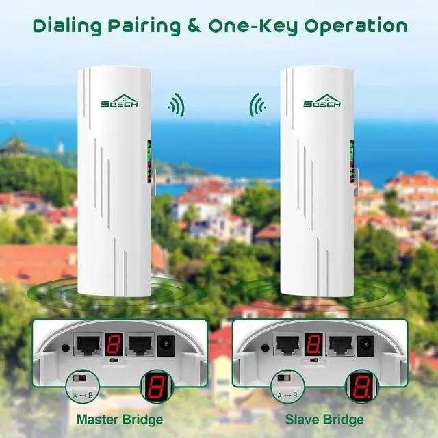 One-key BridgeThe outdoor point to point wireless bridge has a digital tube display, and point-to-point pairing can be completed by dialing. The operation is simple, and there is no need to lay network cables, saving a lot of manpower and costs. This network bridge can be used to connect surveillance cameras through one-key pairing to expand the monitoring range, and can also extend the network to a second building or further away for data connection.