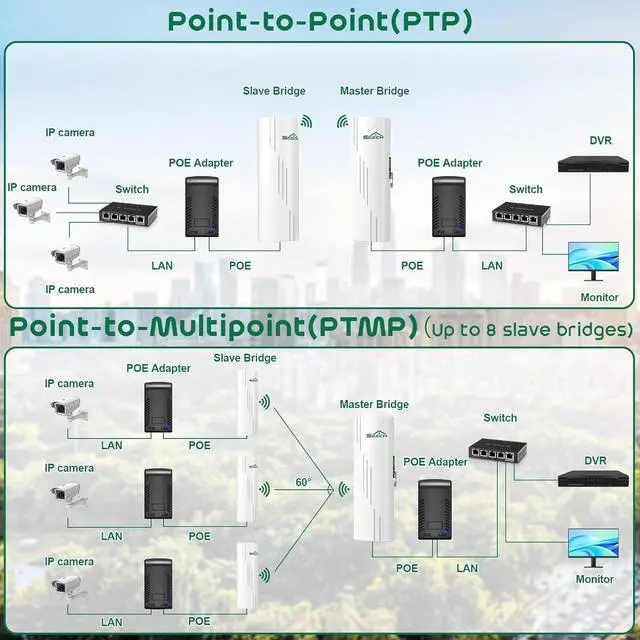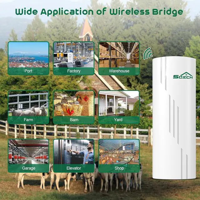 5KM Long Distance TransmissionThe wireless bridge has a built-in 16dBi high-gain directional antenna, with a transmission distance of up to 5KM, which greatly improves the coverage range and can be easily used in factories, farms, warehouses, parking lots, shops and other places. This point to point wireless bridge presets the WDS network mode, which can expand the coverage of the wireless signal and enhance the signal strength, and can be well applied to working modes such as PTP and PTMP.