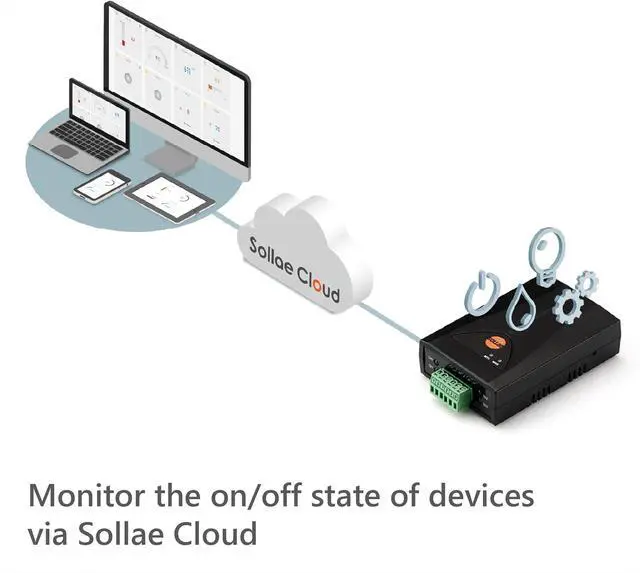 Device reads on/off states of machines and sends them to cloud. The states can be viewed on cloud-based web UI (widget or building/factory's map)