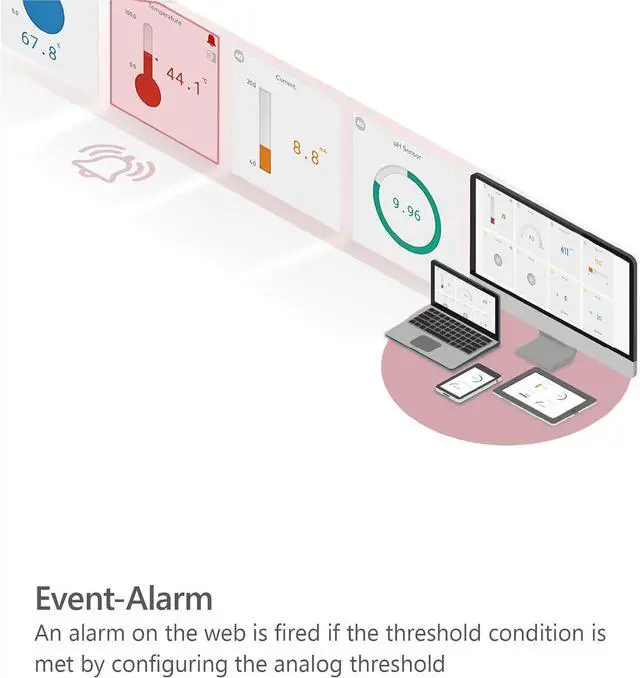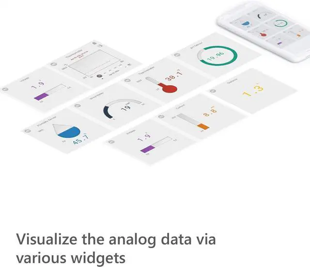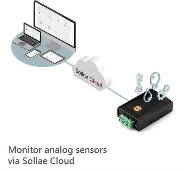 Device reads values from analog sensors and sends them to cloud. The measured values can be viewed on cloud-based web UI (widget or building/factory's map)