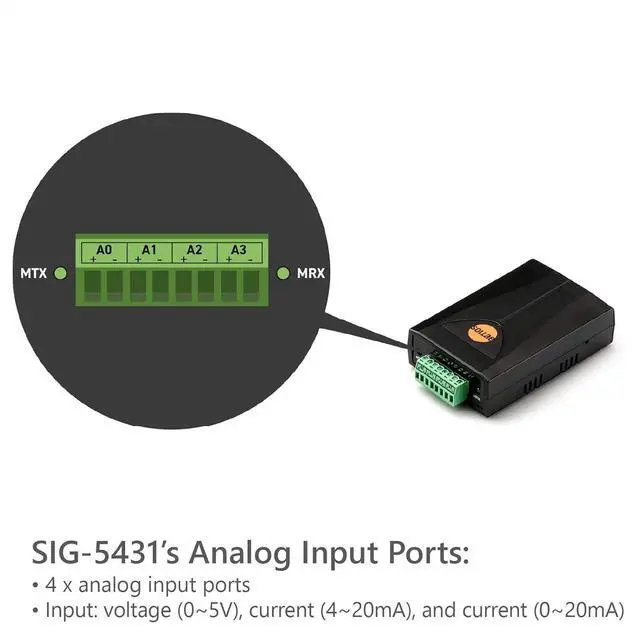 4 analog input ports (12-bit ADC): voltage(0 ~ 5V) , current (4~20mA), and current (0 ~ 20mA)