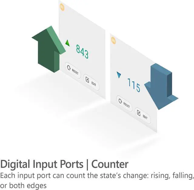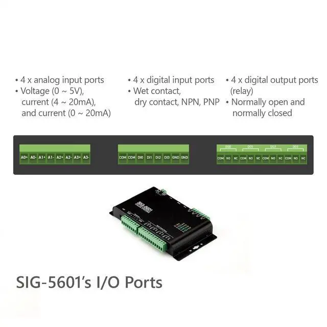 4 digital input ports (4.5V ~ 25V): wet contact, dry contact, NPN, PNP