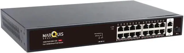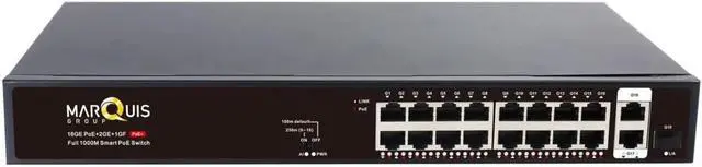 802.3af/at PoE Switch16-port 10/100/1000 Mbps PoE switch with 2 Gigabit RJ45 uplink ports and 2 SFP slots. Supports up to 30W per port with a total PoE power budget of 300W. Dual uplink ports allow connection to routers, NVRs, switches, or other network devices.