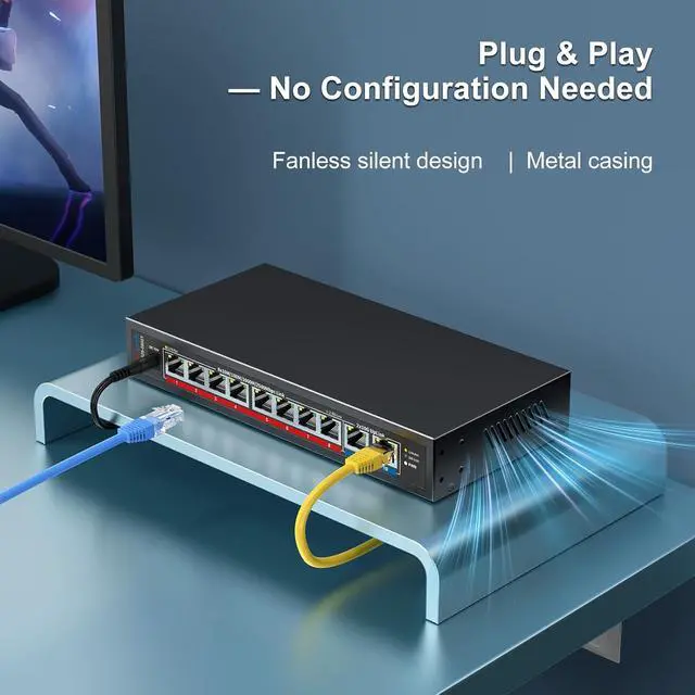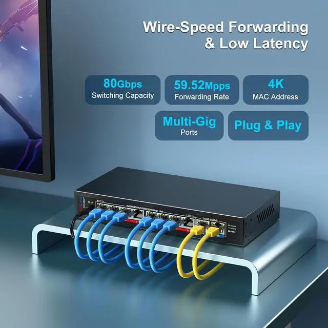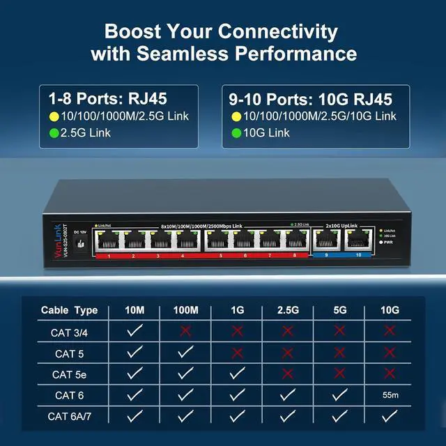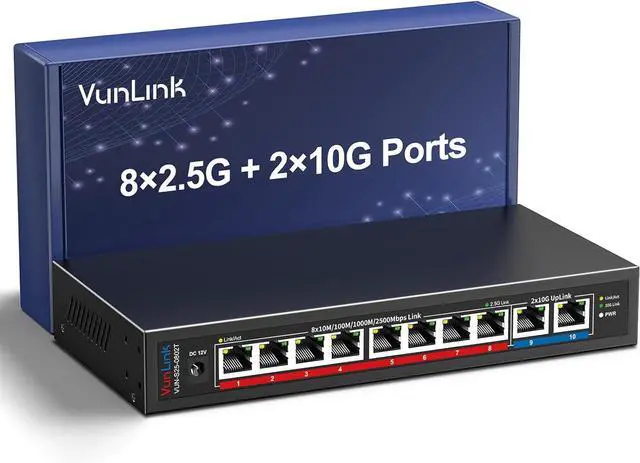 Ultra-Fast 2.5g/10G Connectivity This Ethernet switch features 8×2.5GbE ports and 2×10GbE ports. Ports 18 support 2.5G/1G/100Mbps, while ports 910 support 10G/5G/2.5G/1G/100Mbps, delivering high-speed, stable connections for 10Gb NAS, servers, gaming PCs, WiFi 6 / WiFi 7 devices, 4K/8K media streaming, and home office networks.