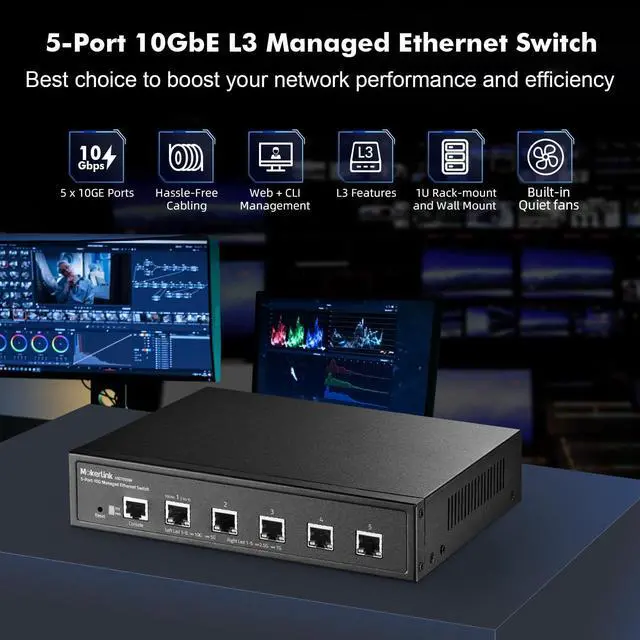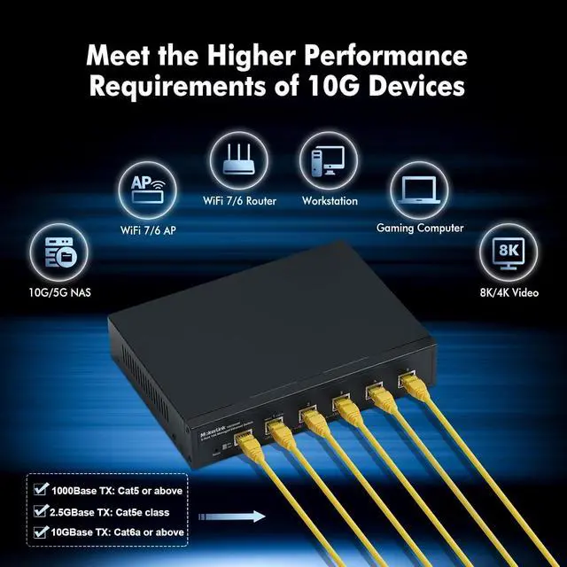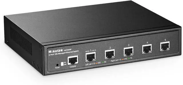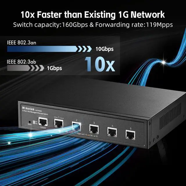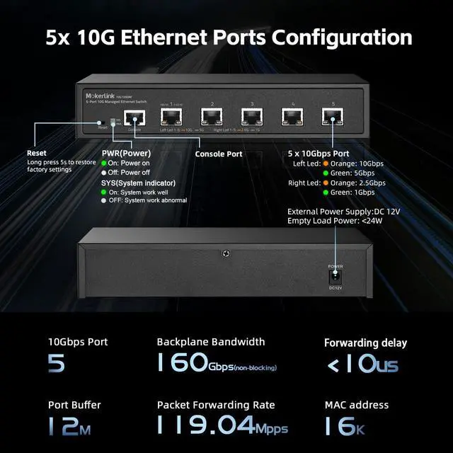 10G Ports: The network switch has 5 x 10Gbps ethernet ports, every port support auto-adaptive 10G/5G/2.5G/1000M/100M data rate, supports auto-flip and wire-speed forwarding