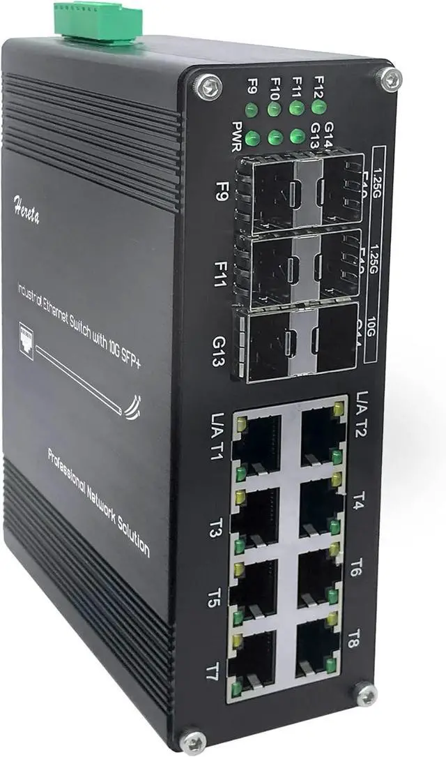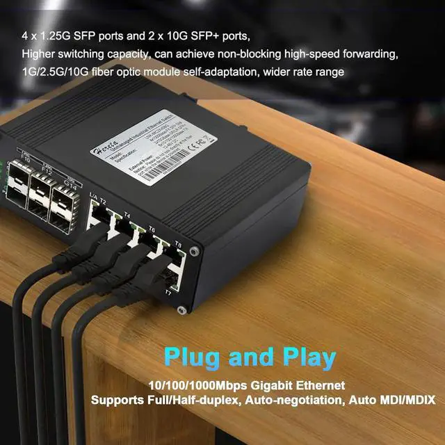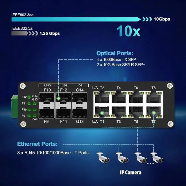 Interface: 10G 14 ports Fiber Optic Ethernet Switch is equipped with 8 10/100/1000BASE-T ports & 4*1.25G SFP Slot+ 2*10G SFP+ Ports. RJ45 ports supports Full/Half-duplex, Auto-negotiation, Auto MDI/MDI, 1000Base-X supports 1 or 2 core Single-mode or Multi-mode fiber, 10G Base-SR/LR ports supports SFP+ module