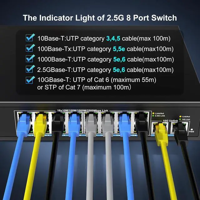 Durable Hardware & Wide Compatibility: Metal housing with dynamic LED indicators for real-time status monitoring. Compatible with Cat5e/Cat6/Cat7 cabling and supports 10GBase-T up to 100m with Cat7 STP.