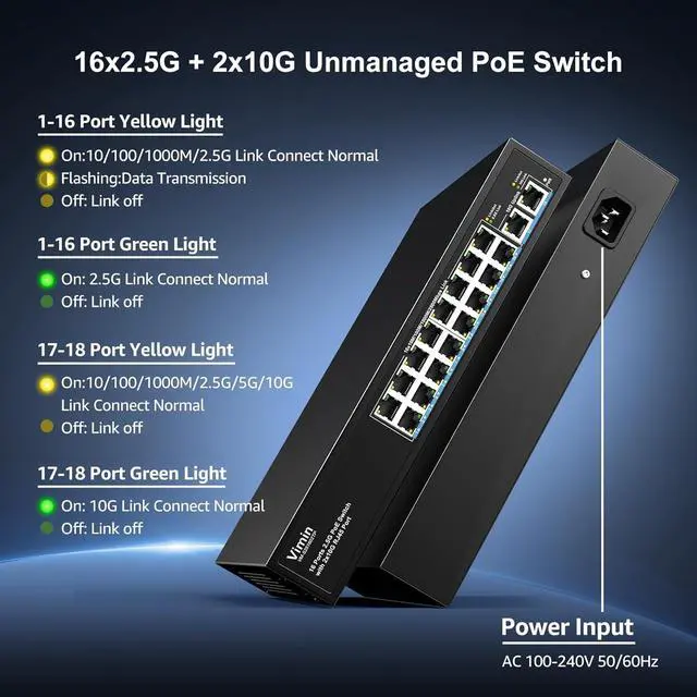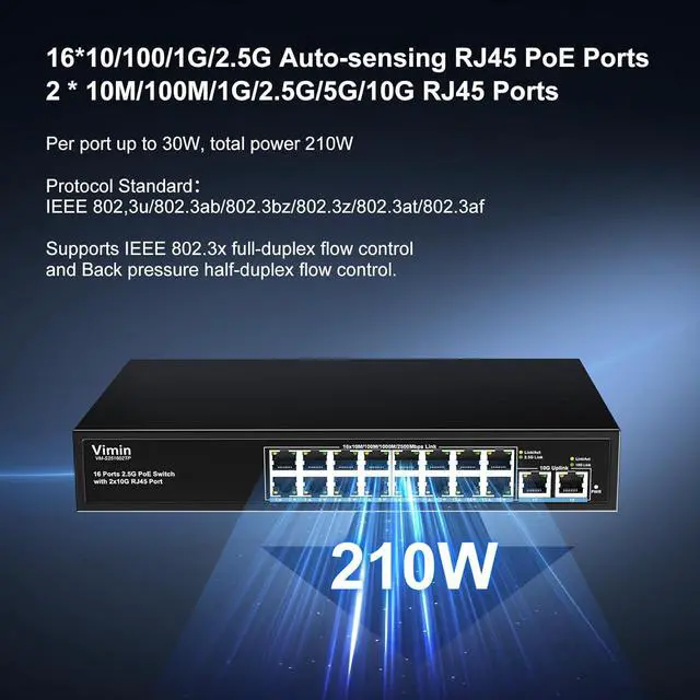 Power over Ethernet+ Support: Ports 116 support IEEE 802.3af/at PoE+ with up to 30W per port, total power 210W. Support IEEE 802.3/802.3u/802.3ab/802.3bz/802.3az/802.3at/802.3af, for powering IP cameras, VoIP phones, wireless APs, and other PoE-compatible devices without additional cabling.