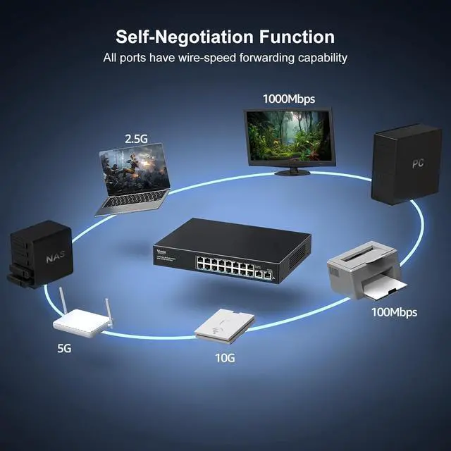 Plug & Play Switch Unmanaged Design: No configuration required. Supports auto-negotiation, auto-MDI/MDIX, and wire-speed forwarding on all ports. Perfect for small businesses, surveillance systems, and home networks.
