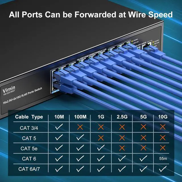 Wire-Speed 10G Network Switch - Non-blocking 80Gbps switching capacity ensures zero packet loss for 4K streaming/gaming, supporting full IEEE 802.3bz 2.5G/10G standards and backward compatibility with CAT5e/CAT6 cables.