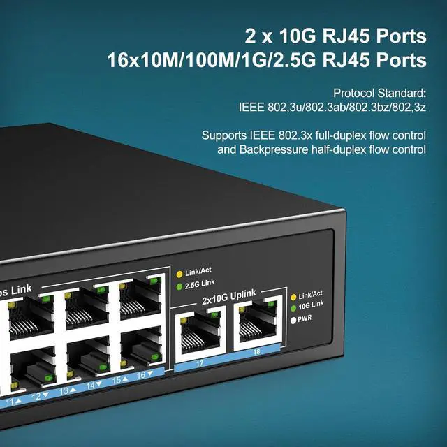2.5G/10G 16+2 Port Aggregation - 16×2.5G & Dual 10G Base-T ports deliver ultra-fast 10/100/1000/2500Mbps auto-negotiation, perfect for bandwidth-intensive NAS/PC connections with future-proof 10G Ethernet scalability.