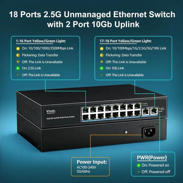 Wider Application - 18-Port 2.5G Ethernet Switch Metal case, fanless design, suited for various application, such as home entrainment, 4K video, gaming PC, NAS, PCIe Adapter, Server, WiFi 6 AP and more.