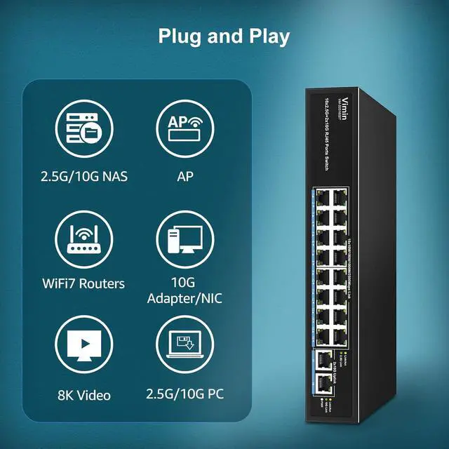 Plug & Play Network Switch - Auto-MDI/MDIX with dynamic LED indicators enables instant deployment - simply connect CAT6A cables for instant 10Gbps uplink without complex configurations.