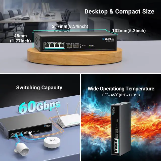 2.5G PoE High Performance: The 2.5G unmanaged poe switch includes 4*100/1000/2500Mbps RJ45 PoE ports, 2*10G uplink SFP ports, ports 1-4 comply with 802.3af/at (PoE+) standards, 4 port poe switch support 10/100/1000M/2.5G adaptive, 60Gbps switching capacity, to meet high-speed network needs.