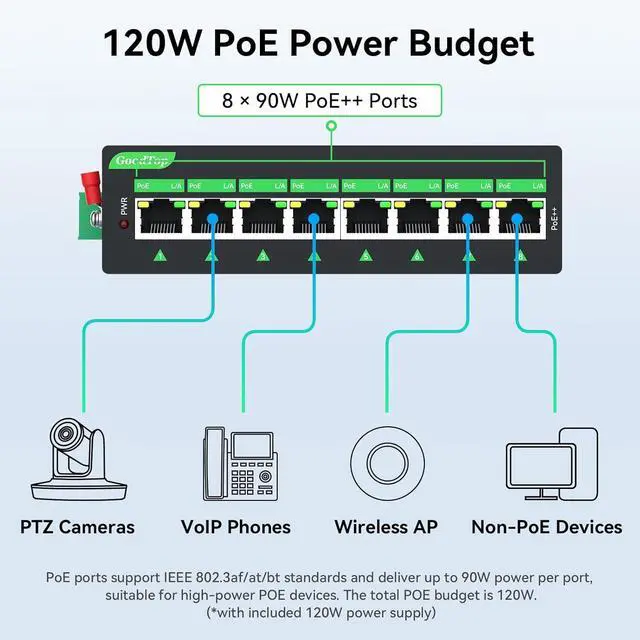 8 Port PoE++ Switch: It supports the IEEE 802.3af/at/bt protocols and can provide up to 90W output, making it suitable for high-power PoE devices such as PoE monitors, PTZ cameras, etc. The total power budget is 120W.
