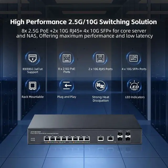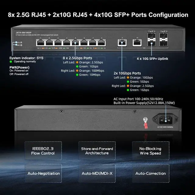 2.5G Ports 8 x 2.5 Gigabit ethernet Ports, compliant IEEE802.3bz (2.5G) standard, 2500Mbps/1000Mbps/100Mbps rate auto-adaptive.