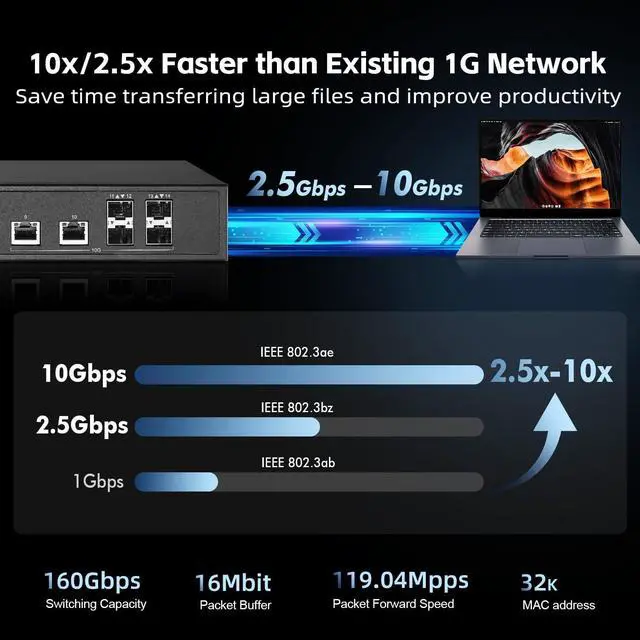 10G Ports 2 x 10G Ethernet Ports, backward compatible with 100M/1000M/2.5G/5Gbps rates. 4 x 10G SFP+ Slot(compatible 1G/10G Module, not include SFP Module). 160Gbps backplane bandwidth, excellent data forwarding performance, perfect for mixing new and old devices