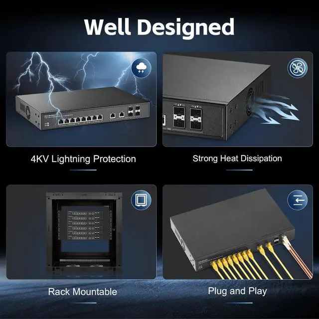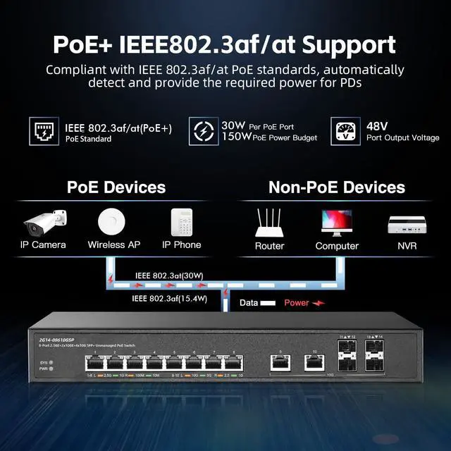 Plug and Play Unmanaged no need configure, just plug in the power cord and ethernet cable, auto-negotiate connected devices. auto MDI/MDIX, without any configuration, works right out of the box
