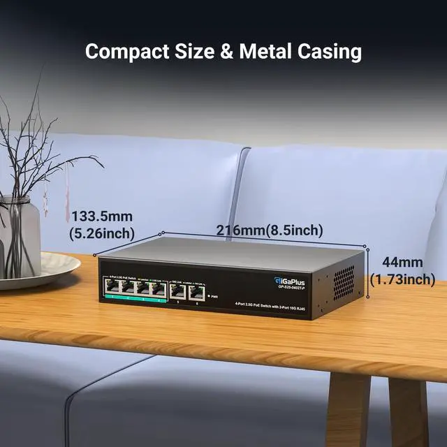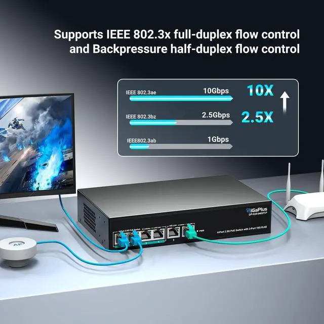 2.5G/10G Device Interface: 4*100/1000/2500Mbps RJ45 PoE Ethernet ports, 2*10G uplink RJ45 ports, Compatible with 1G/2.5G/5G/10G Rate Adaptive. 60G switching capacity, higher uplink bandwidth and improved bandwidth utilization on 10G ports to meet the needs of high speed network requirements.