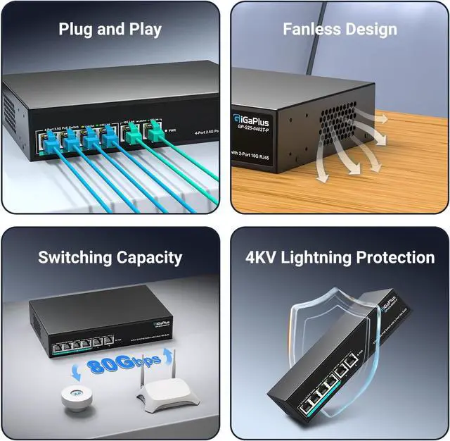 Stable and Quiet: Rugged metal casing and 4KV lightning protection design make this 2.5G/10G PoE network switch safe to use in a variety of environments. The fanless design reduces power consumption, keeps it quiet, and ensures good heat dissipation and stability of the device. Supports desktop and wall mounting.