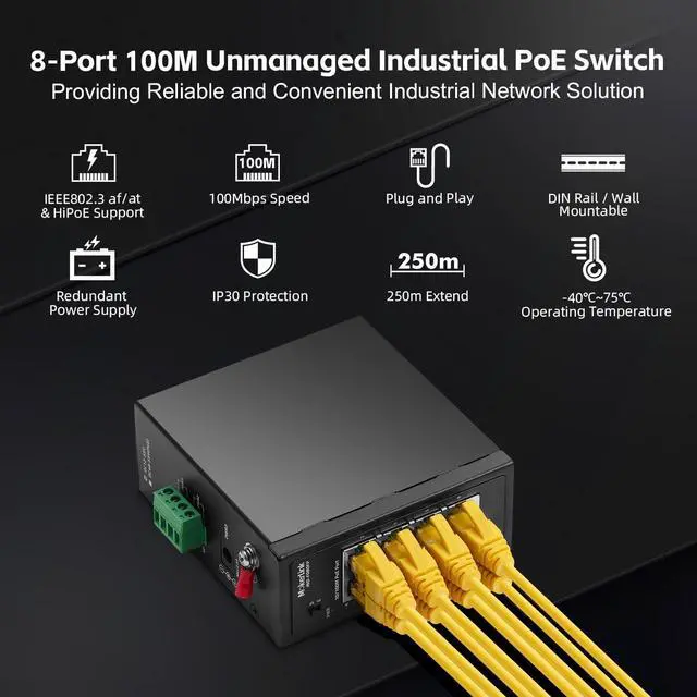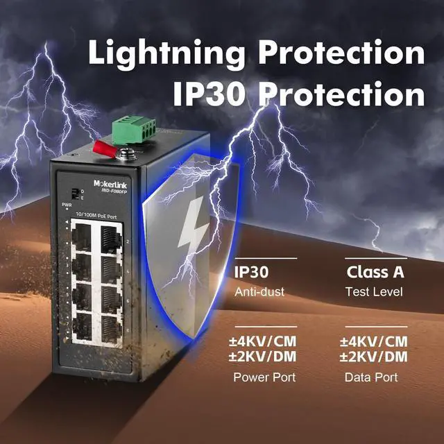 IP30 protection grade, working temperature -40~75°C(-40~185°F), super robustness, anti-lightning, anti-static and anti-overload protection, adapt to various harsh environments
