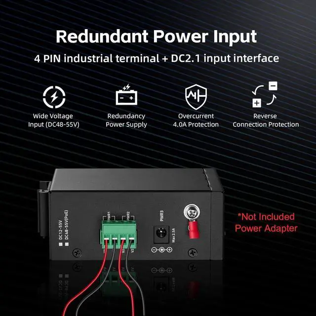 1 DC Power and 2 Industrial power(4 pin terminal), total of 3-way power supply is more flexible. Automatic fault switching, anti-reverse connection does not damage the equipment, higher reliability. ***Please note that the power adapter is not included***