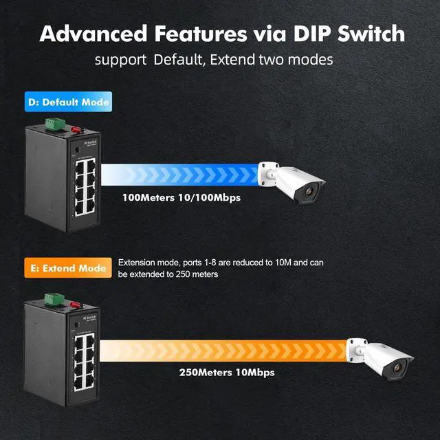 Support Extend Mode, set by dial switch. D: Normal mode, transmission distance 100 meters, transmission rate is 10/100Mbps adaptive; E: Extend mode, ports 1-8 force 10Mbps to extend the transmission distance to 250meters. The shell is made of industrial-grade aluminum alloy, which is more sturdy, compact design and small size, integrated DIN-rail and wall mount kit, installation and disassembly are very simple