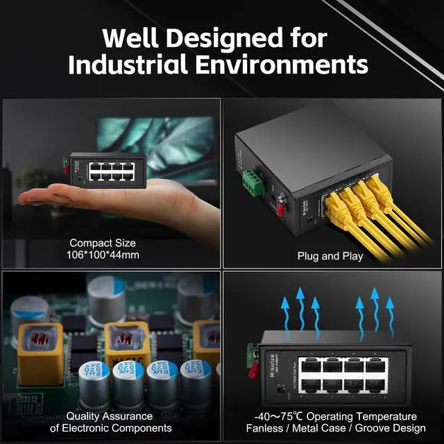 Support auto-negotiation, plug and play, no configuration needed, low-power consumption CPU, no fan quiet operation, green energy saving, suitable for various networks, such as home office, computer room, warehouse, factory, compact control box and other industrial scenarios with ethernet access