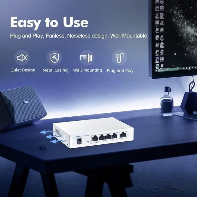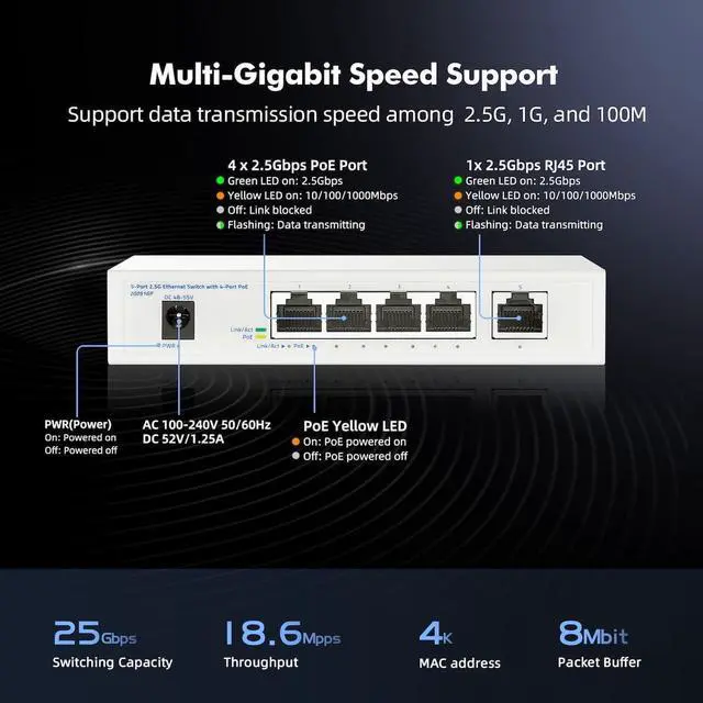 Versatile & Compact Design The compact, silent desktop design fits seamlessly into any environment. Perfect for upgrading your home office, small business, or surveillance network to high-speed 2.5G, providing both superior data transfer and centralized power delivery.