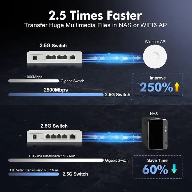 High-Speed 2.5G Connectivity Features 5 x 2.5 Gigabit Ethernet ports, 4 PoE+ & 1 uplink. Supports 10/100/1000/2500Mbps auto-negotiation for maximum compatibility and performance, ideal for bandwidth-intensive applications like Wi-Fi 6/7 APs, NAS, gaming, and 4K/8K surveillance.