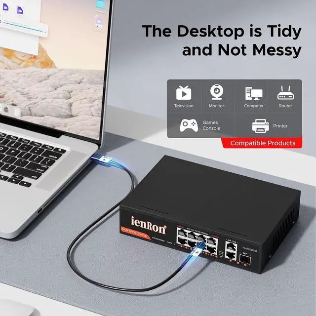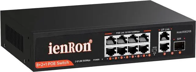 • High-speed connectivity: 11-port Gigabit PoE switch with 8 PoE+ ports (802.3af/at), 2 uplink ports and 1 SFP fiber port; supports 20Gbps full-duplex bandwidth for IP cameras and APs