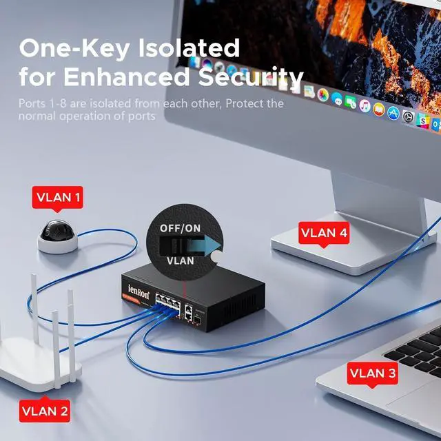 Easy installation: One-touch VLAN switch for port isolation or communication; no configuration required for immediate use in hotels or offices