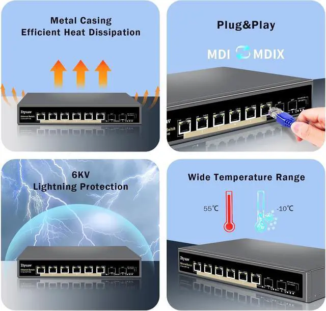Metal and Build-in Cooling FanThe 10G Ethernet switch adopts metal casing, side dissipation holes and build-in cooling fan design, which enables the switch to efficiently dissipate heat and operate stably.