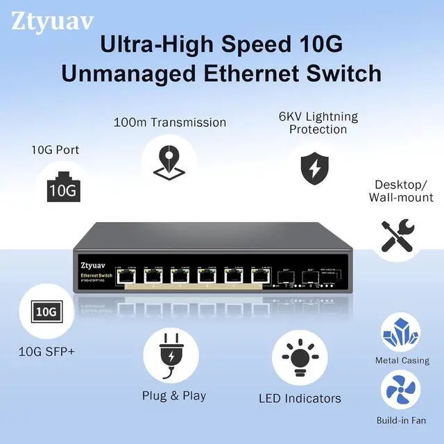 10G High-Speed TransmissionEquipped with 8 x 10G Ethernet ports and 2 x 10G SFP+ ports, which can support bandwidth up to 160Gbps. All ports can achieve non blocking line speed forwarding.