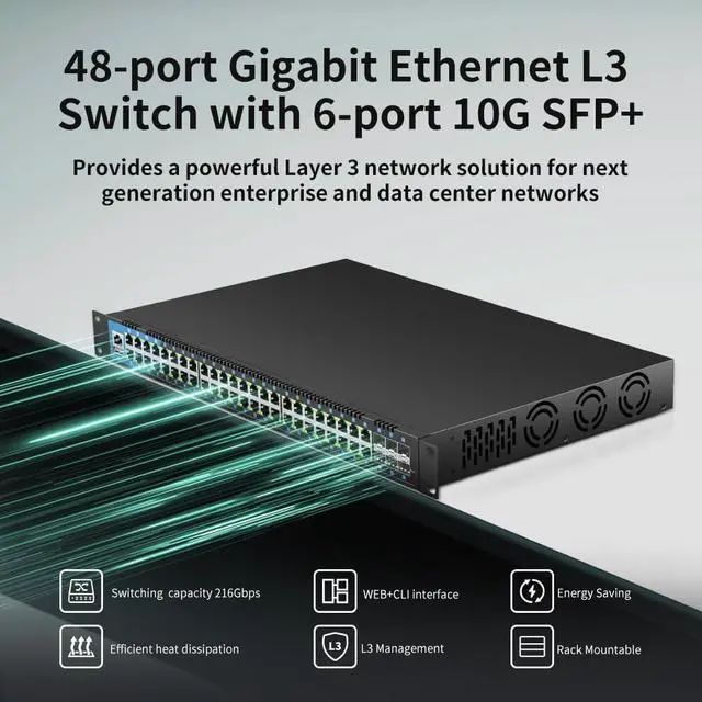 High PerformanceKP-9000-54XGM-X6-ACR Gigabit Switch equipped with 48 x Gigabit RJ45 ports, 6 x 10G SFP slots, 1 x 1G Combo and 1 x USB Port, with a switching capacity of 216G, ensuring stable and reliable data transmission.