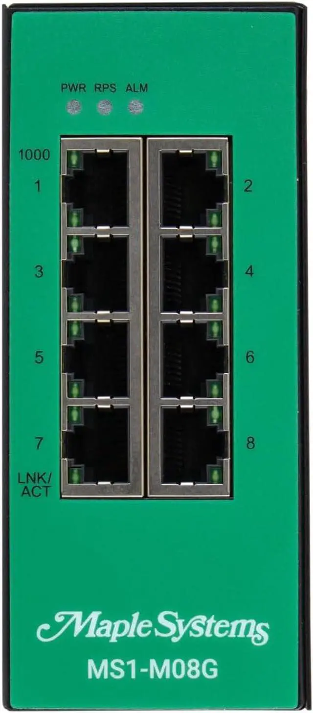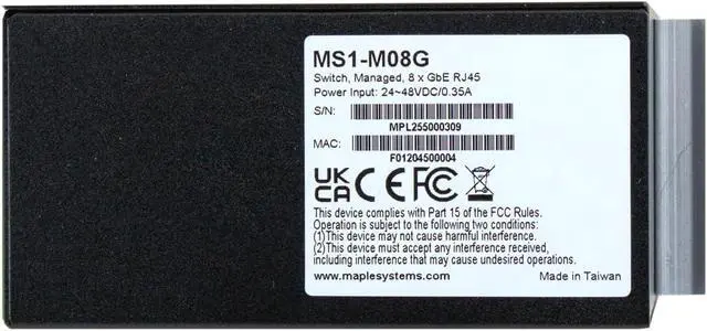 MS1-M08G. Industrial Network Switch, 8-Port Managed Gigabit, RJ45 10/100/1000BASE-T, Metal Housing, Black, DIN-Rail Mount, 1.97x4.56x3.93 inch, 1.21 lb, 24-48VDC.